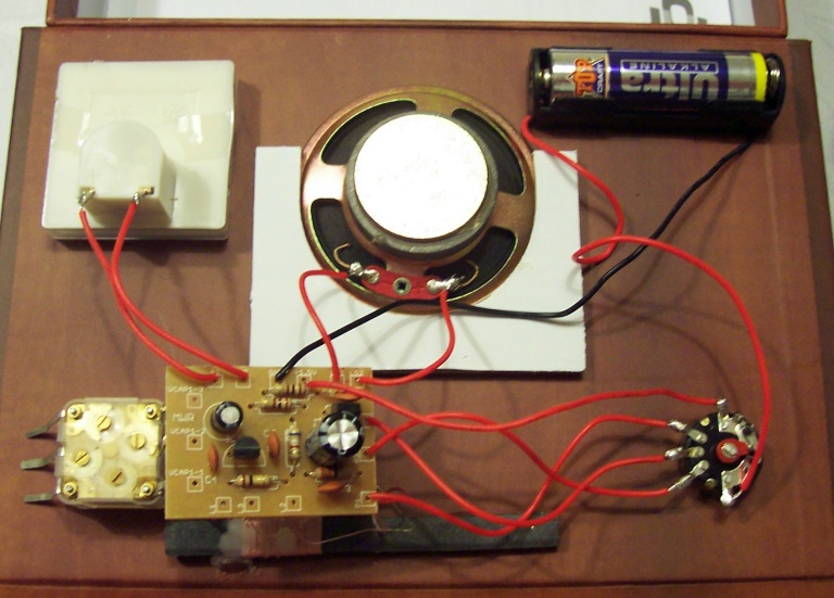 Das fertig aufgebaute Radio. Die Platine ist an den Lötfahnen des Drehkondensators befestigt.
